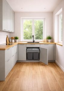Segregacja odpadów nie musi oznaczać bałaganu i konieczności ustawienia w kącie kuchni kilku wolnostojących koszy. Ukryty w zabudowie, ale łatwo dostępny zestaw pojemników sprawia, że codzienna selekcja i wyrzucanie śmieci…