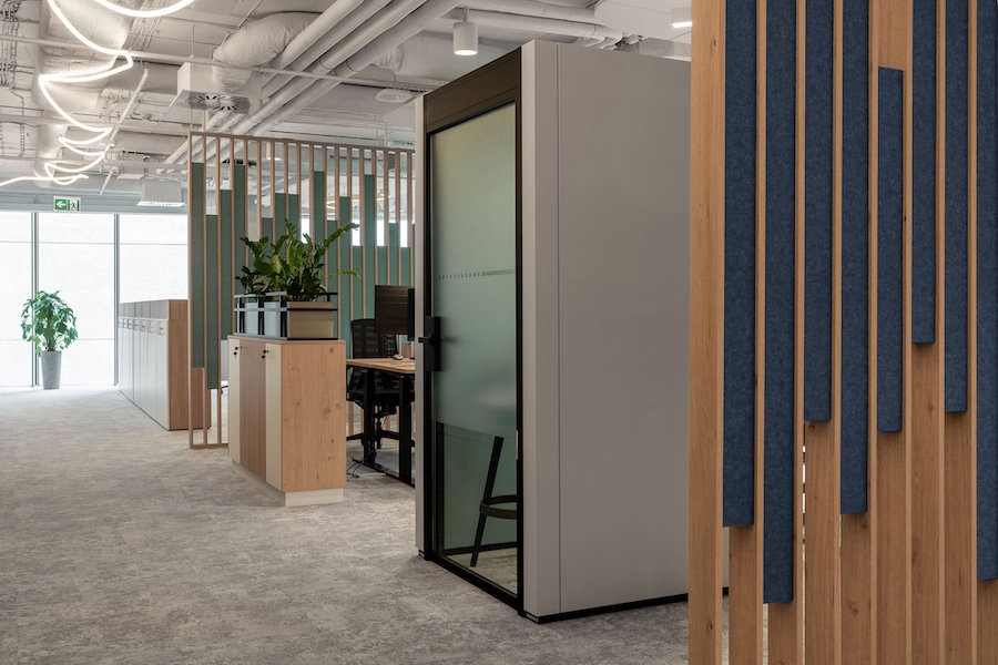 – Dobrze zaprojektowane biuro nie opiera się jedynie na estetyce, ale na precyzyjnym doborze rozwiązań, które ograniczają hałas, minimalizują przebodźcowanie i wspierają naturalne rytmy funkcjonowania. Analizujemy, w jaki sposób pracownicy przemieszczają się po biurze, gdzie rozmawiają, gdzie pracują w skupieniu – architektura musi to odzwierciedlać. – podkreśla Barnaba Grzelecki z pracowni BIT CREATIVE. – Każdy projekt zaczynamy od zrozumienia organizacji – jej struktury, sposobu pracy i realnych potrzeb użytkowników. Rozmawiamy z inwestorem o charakterze procesów, ale bardzo często uzupełniamy tę wiedzę ankietami lub warsztatami z pracownikami. Dzięki temu wiemy, jakie aktywności wymagają ciszy, gdzie potrzebna jest większa współpraca, a które zespoły pracują w rytmie zadaniowym. Projektowanie biura bez takiej diagnozy jest działaniem na oślep. Dopiero gdy mamy pełen obraz funkcjonowania firmy, możemy stworzyć przestrzeń, która odpowiada na jej codzienne wyzwania i faktycznie wspiera ludzi w pracy. – dodaje Barnaba Grzelecki.