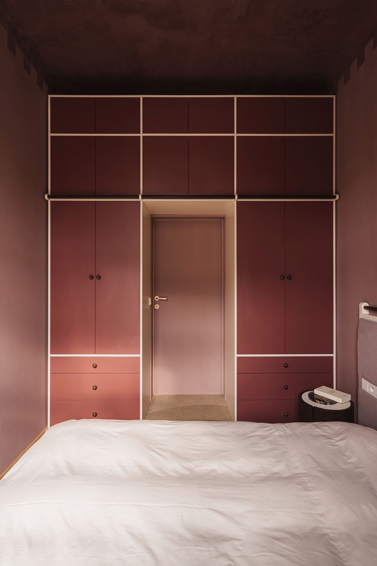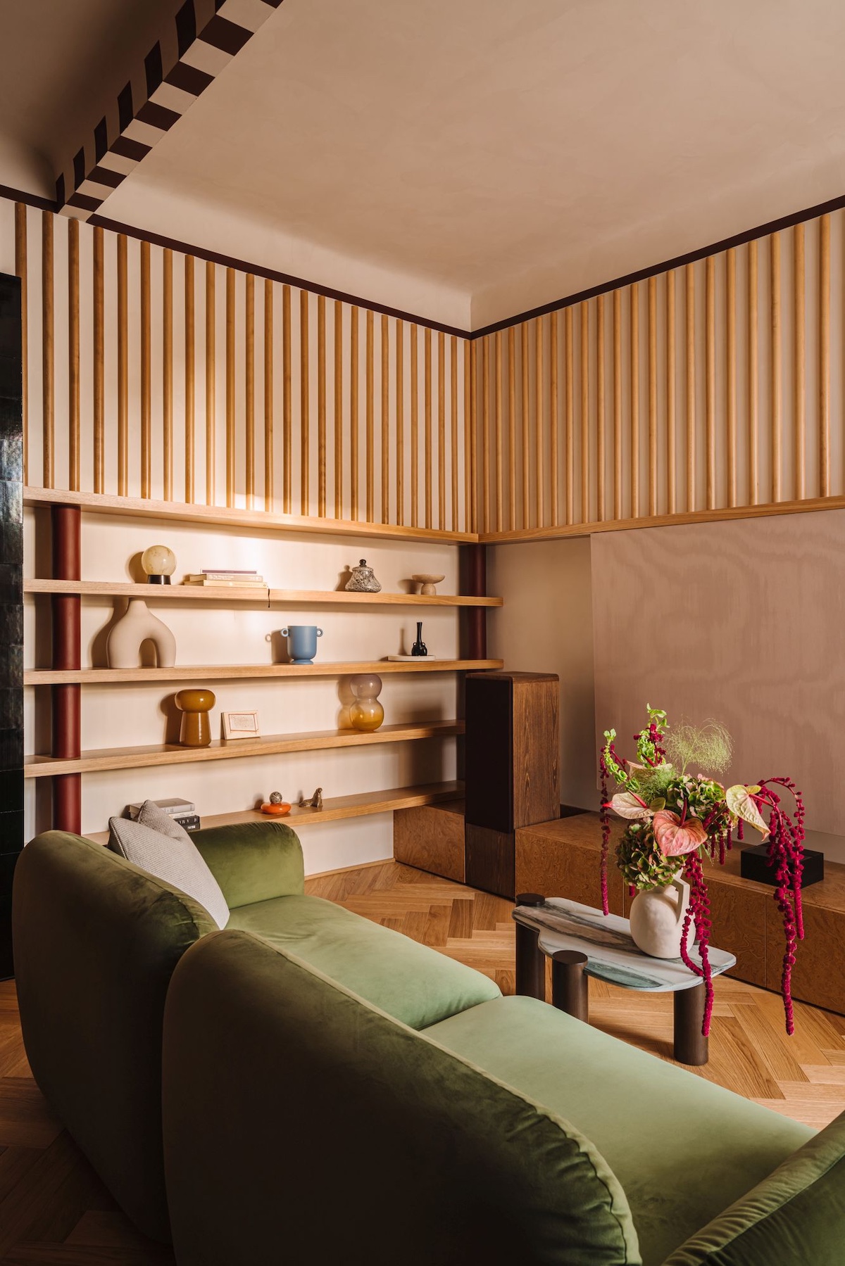 Kolorystyka opiera się na świadomie komponowanych gatunkach drewna oraz delikatnie przetartych, beżowych ścianach. Salon zyskuje charakter dzięki pomarańczowemu świetlikowi, czerwonej obudowie okapu oraz oliwkowej, welurowej sofie marki Calligaris. Całość zamyka raster dębowych półwałków tworzących architektoniczny rytm. Gabinet działa jak drewniane pudełko z wyrazistym gzymsem, dając użytkownikom poczucie intymnej koncentracji. Sypialnia to gra fioletów o barokowym rodowodzie, zestawionych z piaskową wykładziną i charakterystycznym motywem szachownicy przechodzącym na sufit. Łazienka celebruje szlachetność kamieni. Verde Guatemala zestawiono tu z Rojo Alicante i Rosso Levanto, tworząc zmysłową, odważną kompozycję. Sztuka, choć obecna oszczędnie, nadaje wnętrzu indywidualną tożsamość. Pojawiają się tu prace Normana Leto, Magdy Karpińskiej i Tomka Barana.