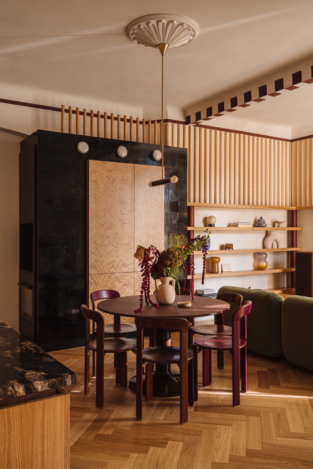 W samym sercu Starego Mokotowa, w kamienicy z 1912 roku, która w niezmienionej formie przetrwała II Wojnę Światową, powstało mieszkanie o wyjątkowym, wieloplanowym charakterze. Budynek, oszczędzony przez bombardowania dzięki bliskości dawnych koszar, do dziś zamieszkują potomkowie pierwszych lokatorów. Stworzyli tu unikalną, wielopokoleniową tkankę miejsca. Dzięki pomocy architekta Wojciecha Nowaka z NOWW powstała przestrzeń, która w nowoczesny sposób opowiada o historii, rzemiośle i współczesnej estetyce.
