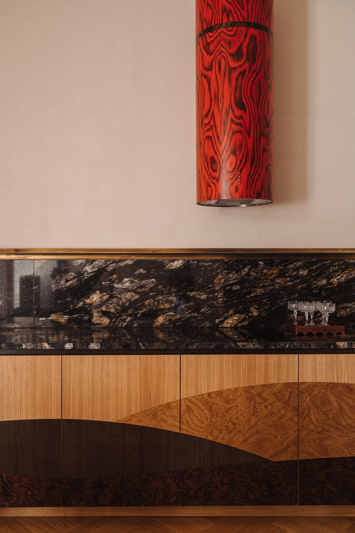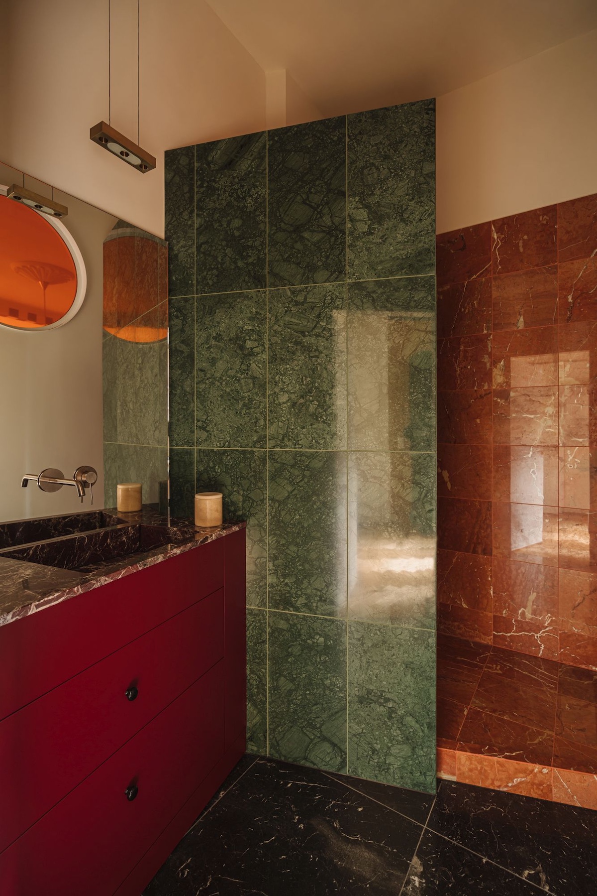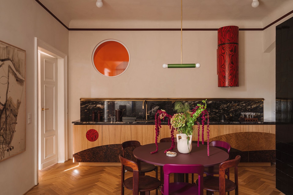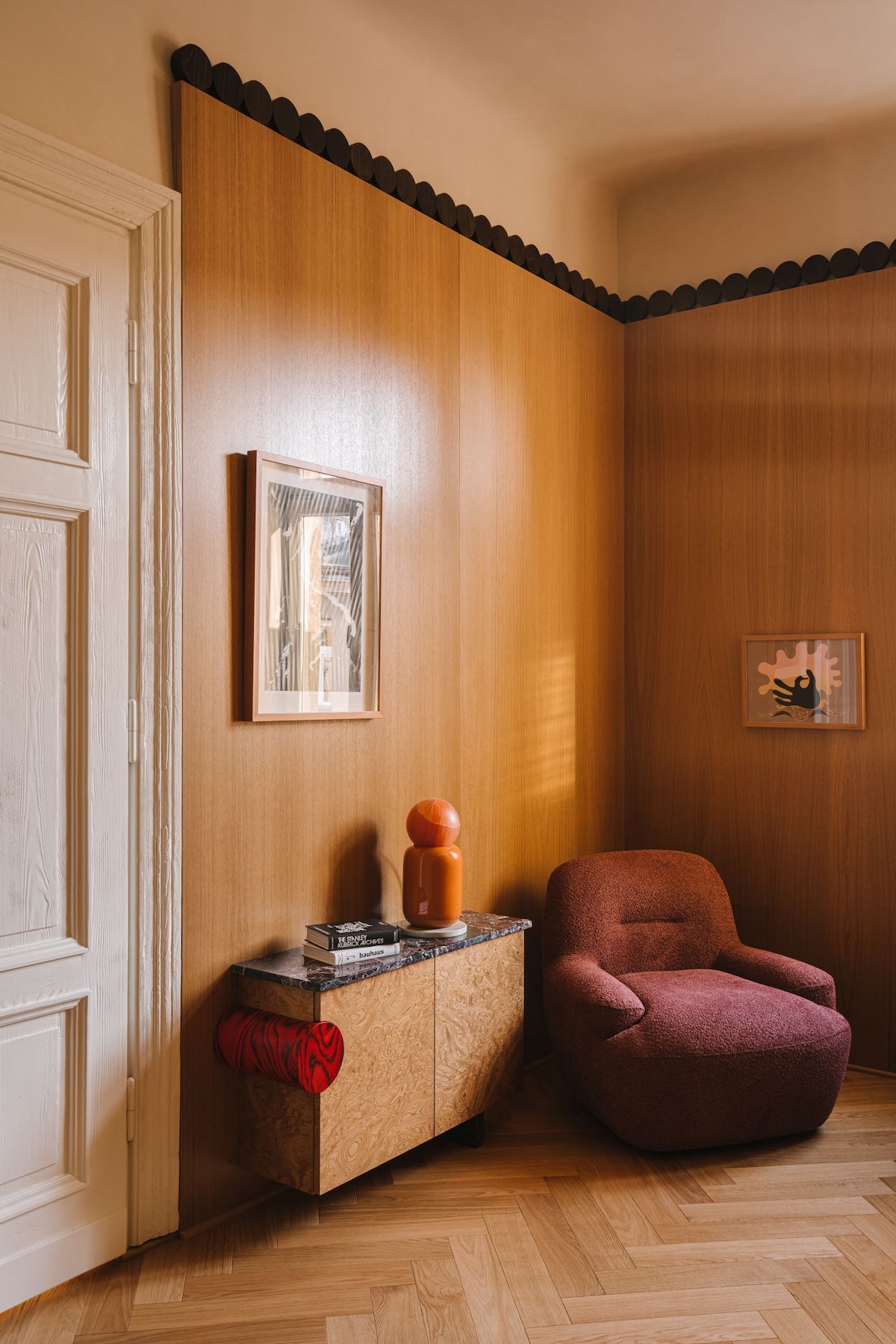 Kolorystyka opiera się na świadomie komponowanych gatunkach drewna oraz delikatnie przetartych, beżowych ścianach. Salon zyskuje charakter dzięki pomarańczowemu świetlikowi, czerwonej obudowie okapu oraz oliwkowej, welurowej sofie marki Calligaris. Całość zamyka raster dębowych półwałków tworzących architektoniczny rytm. Gabinet działa jak drewniane pudełko z wyrazistym gzymsem, dając użytkownikom poczucie intymnej koncentracji. Sypialnia to gra fioletów o barokowym rodowodzie, zestawionych z piaskową wykładziną i charakterystycznym motywem szachownicy przechodzącym na sufit. Łazienka celebruje szlachetność kamieni. Verde Guatemala zestawiono tu z Rojo Alicante i Rosso Levanto, tworząc zmysłową, odważną kompozycję. Sztuka, choć obecna oszczędnie, nadaje wnętrzu indywidualną tożsamość. Pojawiają się tu prace Normana Leto, Magdy Karpińskiej i Tomka Barana.
