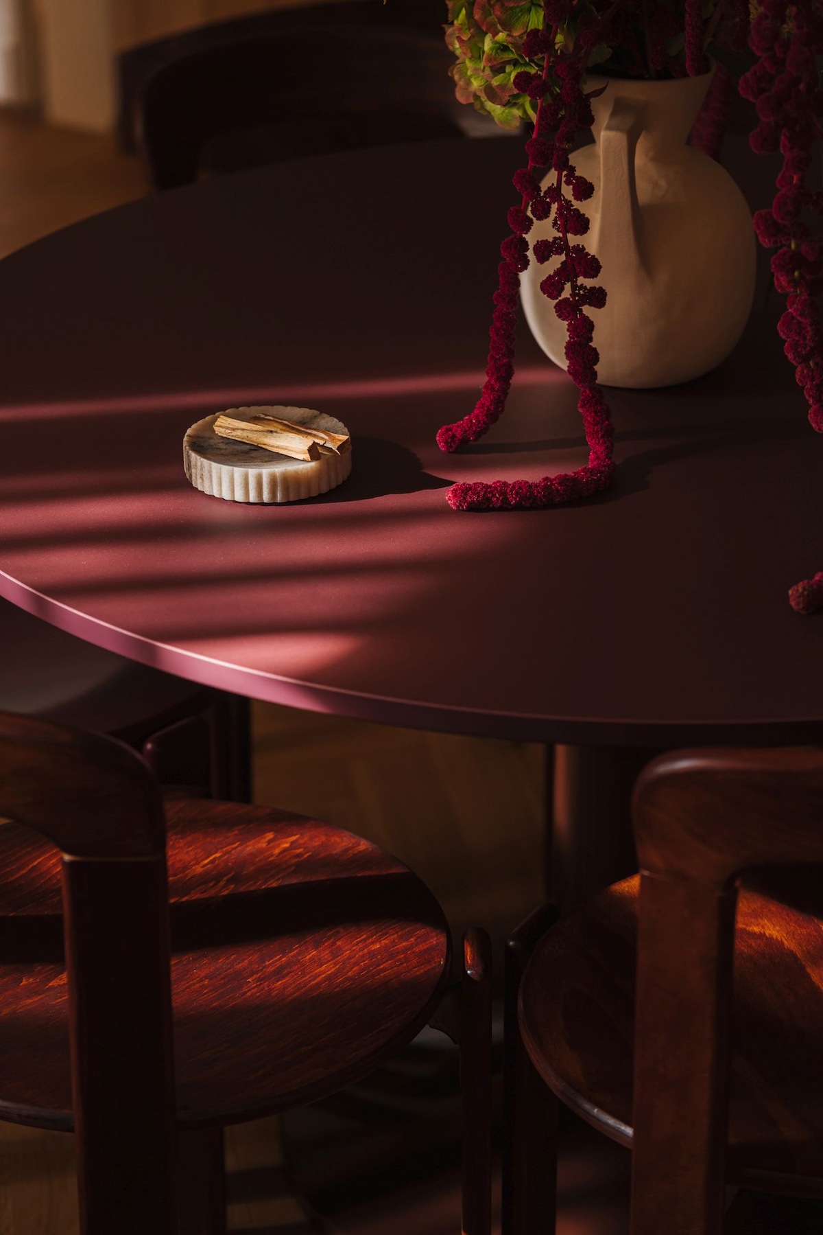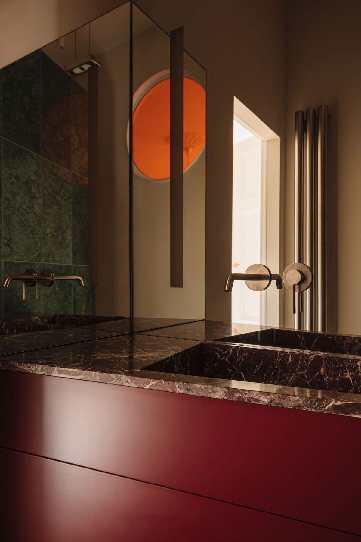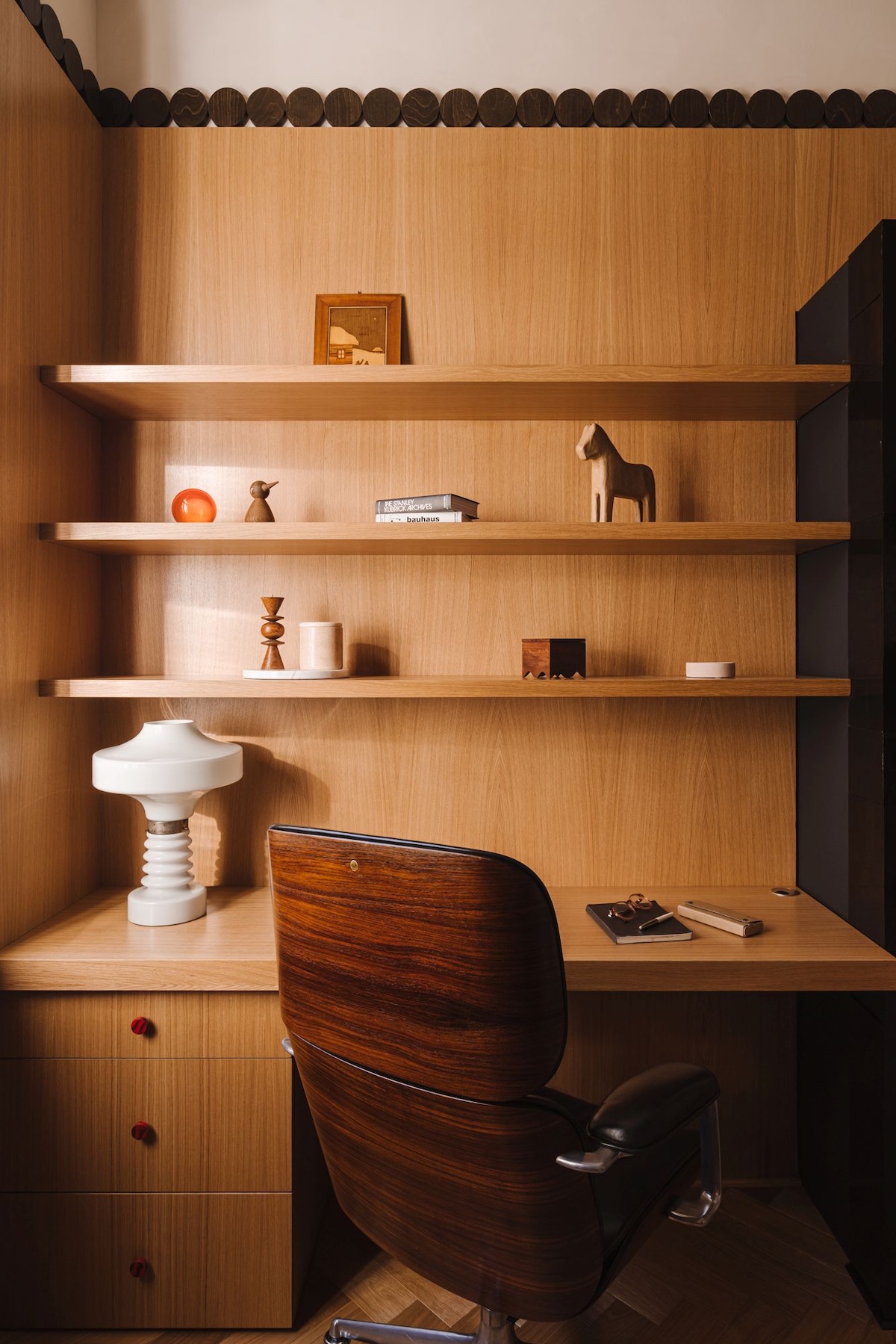 Kolorystyka opiera się na świadomie komponowanych gatunkach drewna oraz delikatnie przetartych, beżowych ścianach. Salon zyskuje charakter dzięki pomarańczowemu świetlikowi, czerwonej obudowie okapu oraz oliwkowej, welurowej sofie marki Calligaris. Całość zamyka raster dębowych półwałków tworzących architektoniczny rytm. Gabinet działa jak drewniane pudełko z wyrazistym gzymsem, dając użytkownikom poczucie intymnej koncentracji. Sypialnia to gra fioletów o barokowym rodowodzie, zestawionych z piaskową wykładziną i charakterystycznym motywem szachownicy przechodzącym na sufit. Łazienka celebruje szlachetność kamieni. Verde Guatemala zestawiono tu z Rojo Alicante i Rosso Levanto, tworząc zmysłową, odważną kompozycję. Sztuka, choć obecna oszczędnie, nadaje wnętrzu indywidualną tożsamość. Pojawiają się tu prace Normana Leto, Magdy Karpińskiej i Tomka Barana.