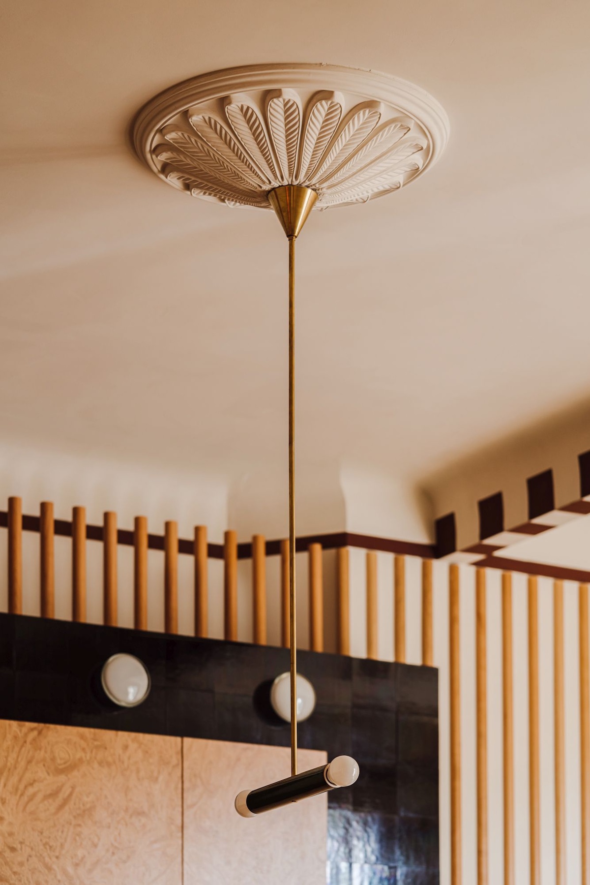 Główną ideą projektu było stworzenie przestrzeni o zapamiętywalnym charakterze, pełnej przenikających się planów, materiałów i kolorów, które razem zbudują spokojną, ale wyrazistą kompozycję. Wnętrze nie poddaje się jednoznacznym klasyfikacjom stylistycznym. Pojawiają się tu elementy różnych epok i rzemiosł, interpretowane na nowo; od szaf pokrytych oryginalnymi, czarnymi, emaliowanymi płytkami z lat 60., po kuchenne fronty inspirowane intarsją. Wspólnym mianownikiem jest świadomość stosowania faktur, odważne zestawienia kamieni i misternie zaprojektowane światło. Centralnym akcentem jest świetlik pomiędzy kuchnią a łazienką, rozświetlający salon niczym miniaturowe słońce i wieńczący kuchenną zabudowę.