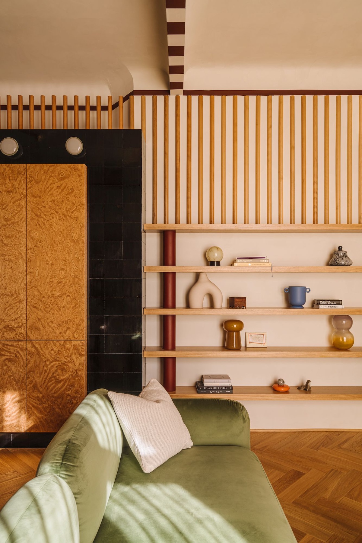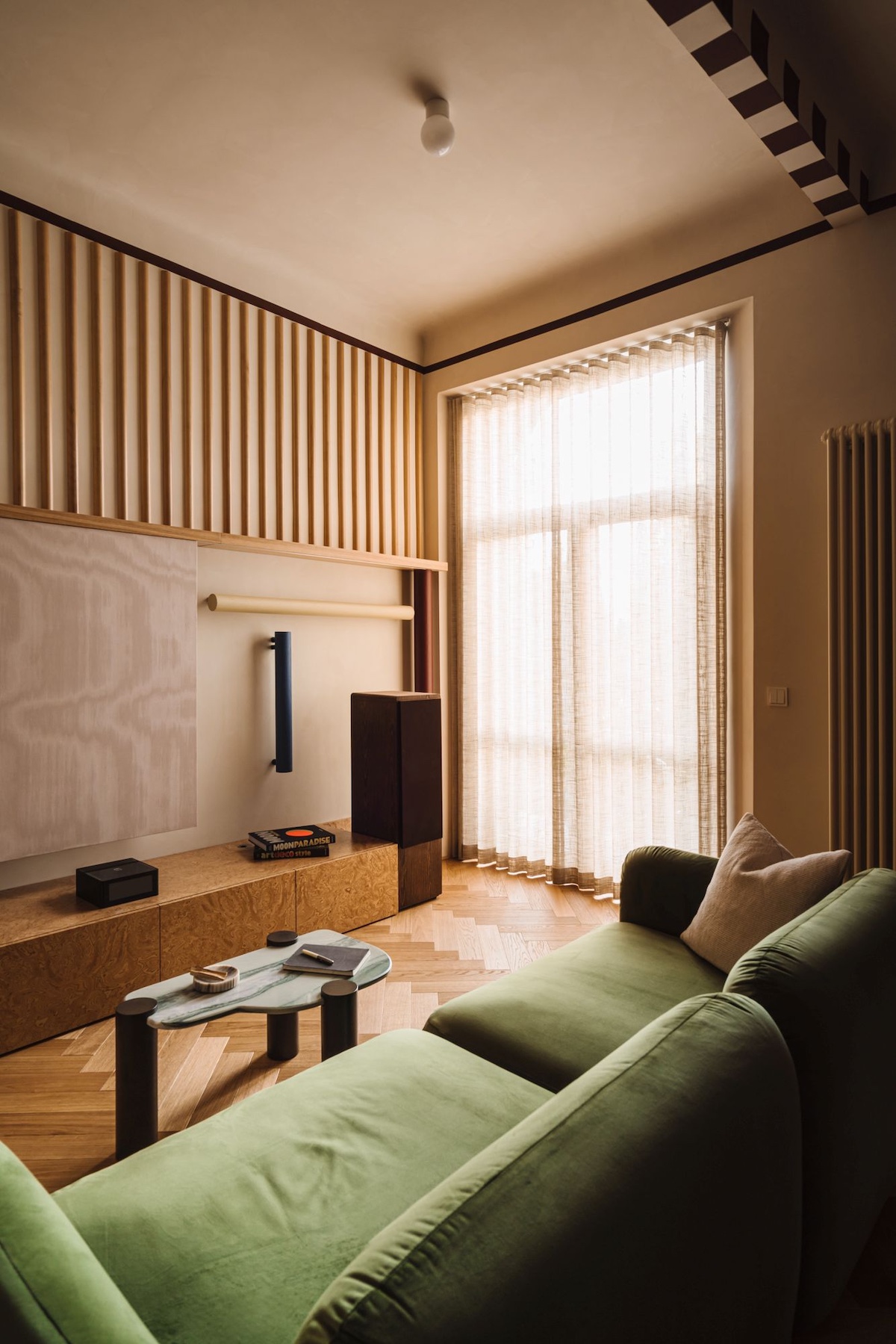 W samym sercu Starego Mokotowa, w kamienicy z 1912 roku, która w niezmienionej formie przetrwała II Wojnę Światową, powstało mieszkanie o wyjątkowym, wieloplanowym charakterze. Budynek, oszczędzony przez bombardowania dzięki bliskości dawnych koszar, do dziś zamieszkują potomkowie pierwszych lokatorów. Stworzyli tu unikalną, wielopokoleniową tkankę miejsca. Dzięki pomocy architekta Wojciecha Nowaka z NOWW powstała przestrzeń, która w nowoczesny sposób opowiada o historii, rzemiośle i współczesnej estetyce.