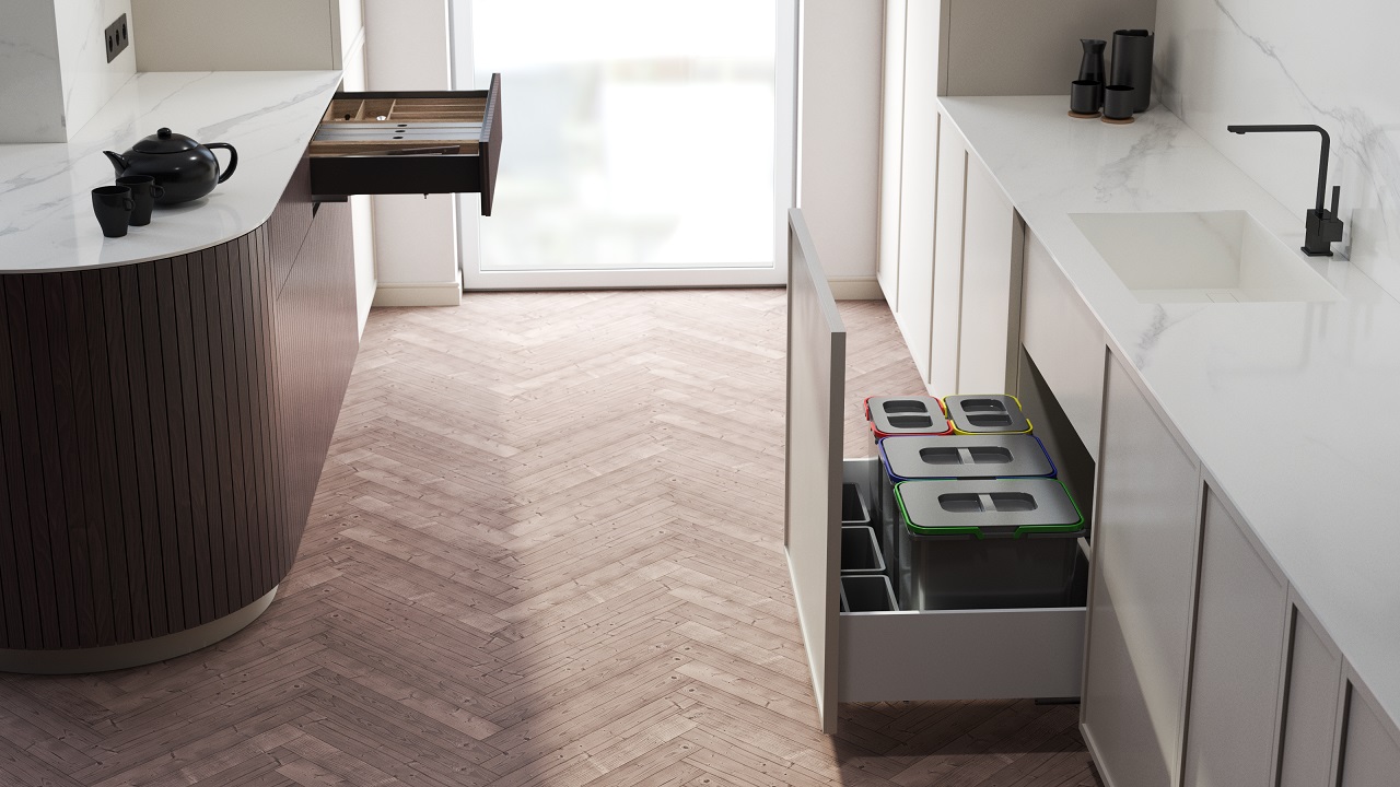 Inną opcją jest SEGREGO, czyli zestaw koszy na stelażu, który mocuje się jak zwykłą szufladę. To kompletne rozwiązanie składające się z: systemów jezdnych mocowanych do ścianek bocznych korpusu, kilku koszy (od 2 do 4, o wysokości 32 lub 42,5 cm oraz różnej pojemności) oraz pokrywy pełniącej funkcję dodatkowej półki. SEGREGO pasuje do szafek o szer. 45, 50, 60 i 80 cm.